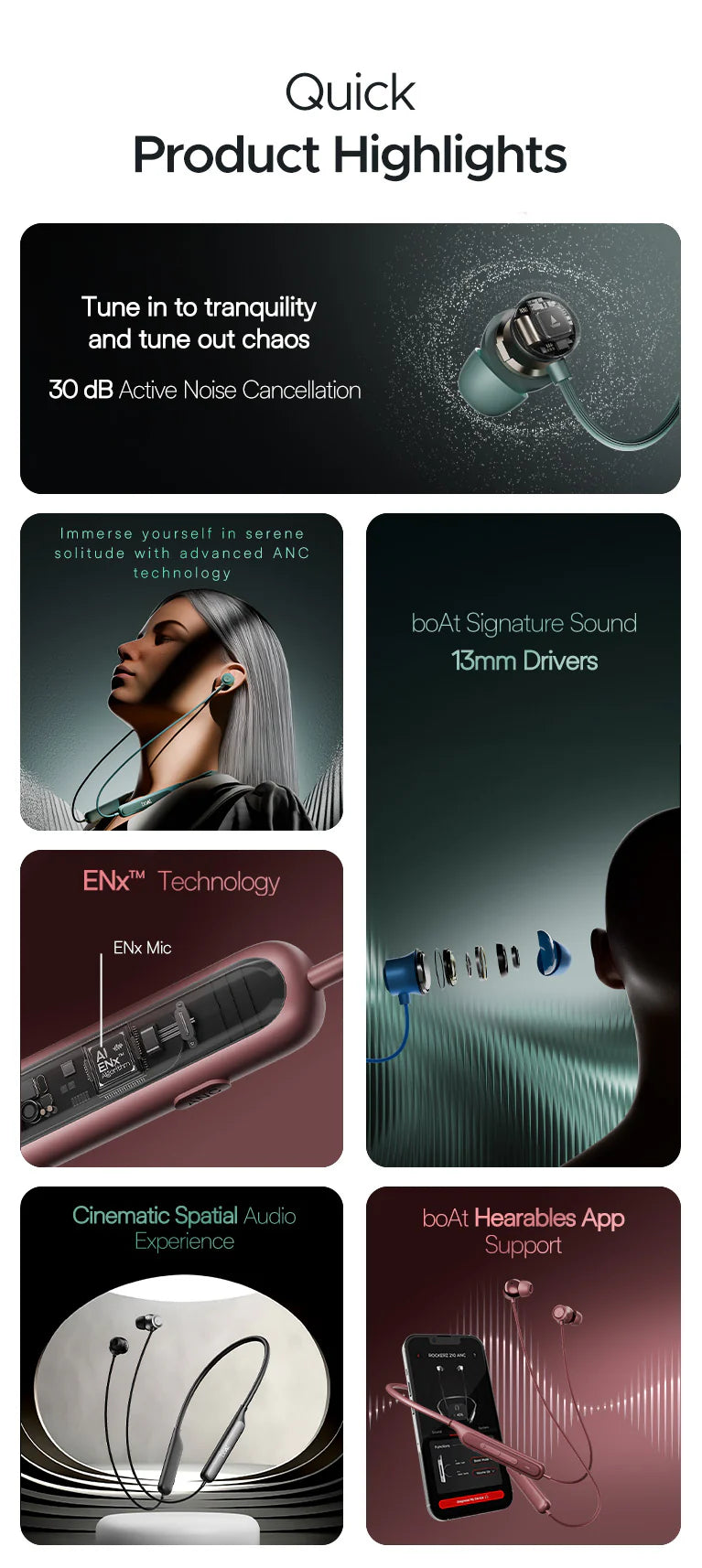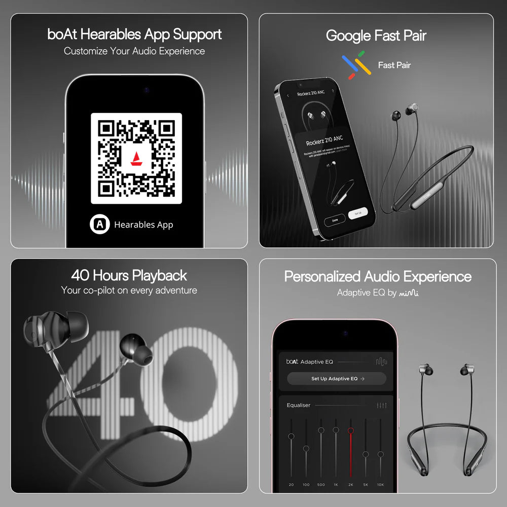 1 UNIT boAt Rockerz 210 ANC, 1 Unit USB Type - C Charging Cable, 1 UNIT Manual, 1 UNIT Catalogue, 1 UNIT Warranty Card